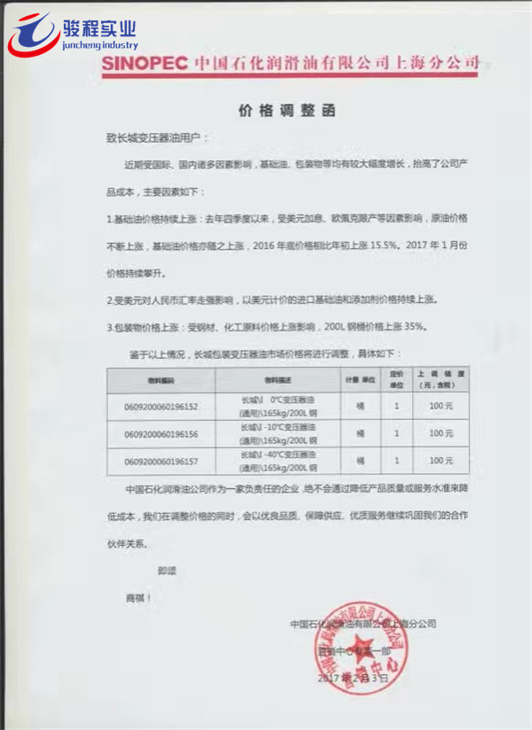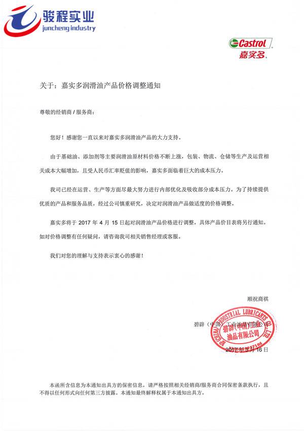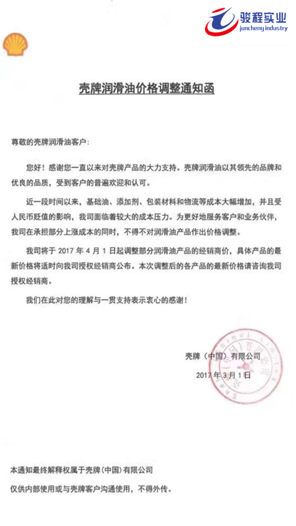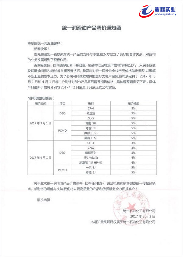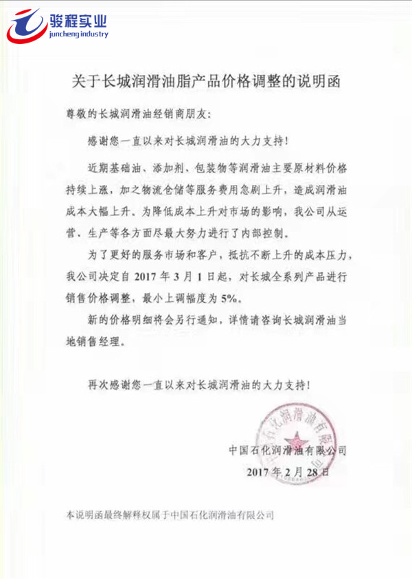当前位置:骏程实业首页 » 骏程实业资讯中心 » 骏程动态 » 长城、美孚、壳牌、统一、嘉实多发布价格调整通知函