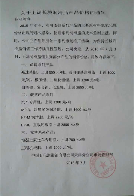 长城润滑脂部分产品涨价通知