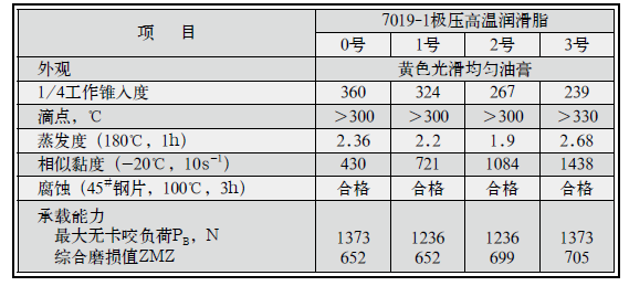 长城牌7019-1极压高温润滑脂是以复合皂稠化合成油,并加入极压、抗氧、防锈等多种添加剂精制而成。按稠度等级分为00、0、1、2、3五个牌号。适用于石油化工、纺织、印染、矿山、钢铁和浮法玻璃等各行业生产中的高温轴承,各种中、重负荷滚珠、滚柱、滑动轴承以及烘烤设备的齿轮、链条托轮等传动部位和连轴节等部位的润滑。