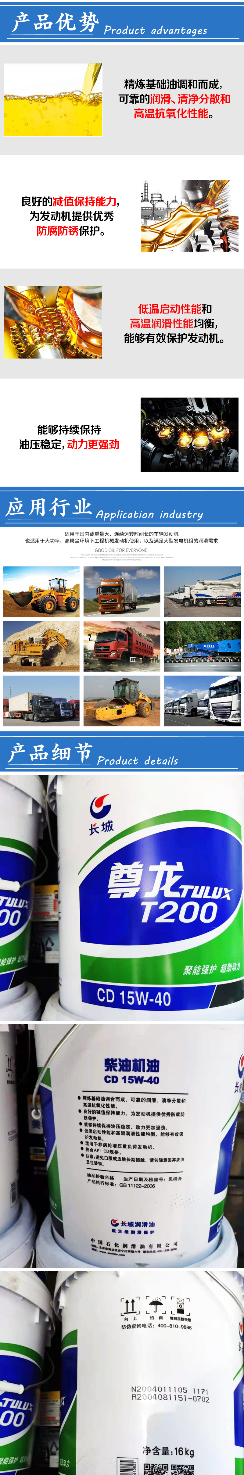尊龙TULUX T200 可靠的润滑性,有效保护发动机; 持久地为发动机提供防腐防锈保护; 适用于要求使用CD或CC级油的增压、非增压柴油发动机; 符合美国石油学会API CD规格。