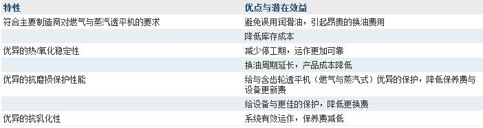 对於输出功率高的新型固定式燃气透平机而言,的热稳定性/防止热降解以控制沉积等性能是关键的要求。严苛的工作状态使润滑油承受热应力,造成滤油器堵塞、伺服阀门产生沉积,或使油品寿命缩短等情况。对於新型的蒸汽透平机,除了需要较强的抗氧化能力外,当发生蒸汽泄漏的情况时,也需有良好的分水性。至於联合循环发电透平机,其润滑油则必需同时满足两类透平机的要求。